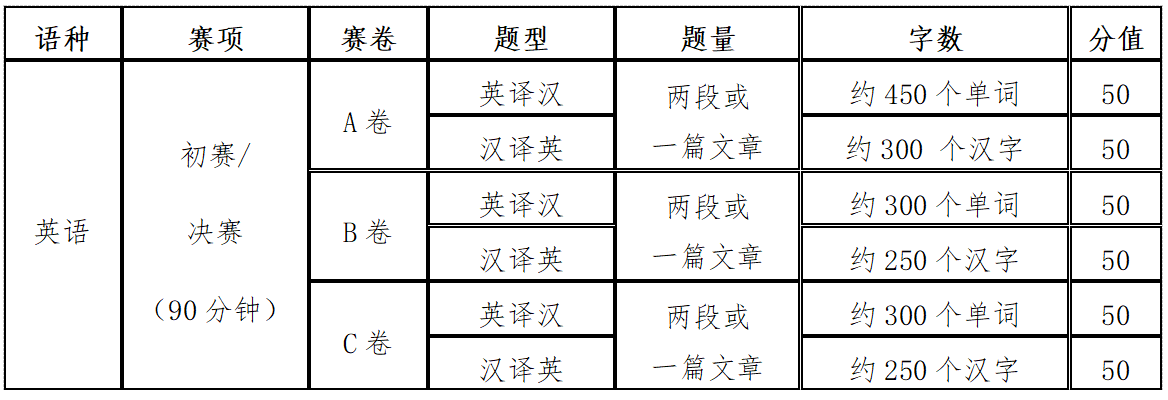 初赛 决赛 (90分钟) | 古代诗词译写 | 1 题 | 完整译写诗词后写60词左右的英文评述 | 40 分 |