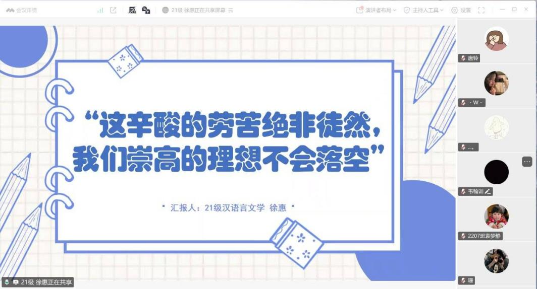 首先进行分享的是来自21级汉语言文学2班徐惠学姐,她从个人备考概况、各科复习策略、时间管理与心态调整等方面展开分享。在个人备考概况中,她提醒学弟学妹择校需综合考量各方面因素,建议通过目标院校官网、直系学长学姐获取精准信息;在各科复习策略上,针对政治、英语学科向我们推荐了备考书目及课程;在时间管理与心态调节方面,她提出找准学习节奏,在心态疲惫时适当休息,自我怀疑时冷静分析调整,同时要保持饮食、作息规律,坚持运动,并善用哔哩哔哩考研课程、优质公众号等资源。最后,她以“这辛酸的劳苦绝非徒然,我们崇高的理想不会落空”激励大家。