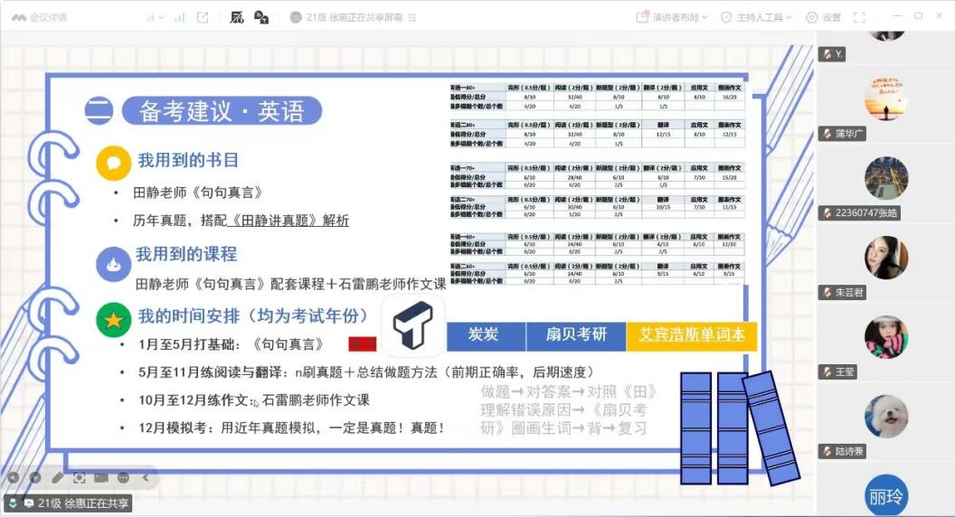 最后分享的王小雁同学,从专业考试科目、复习规划、就业前景入手。明确考试科目后针对性选择参考书目,分阶段进行基础、强化、冲刺复习。同时介绍学前教育专业就业方向广泛,包括幼儿教师、研究员、早教机构管理等,就业前景乐观。