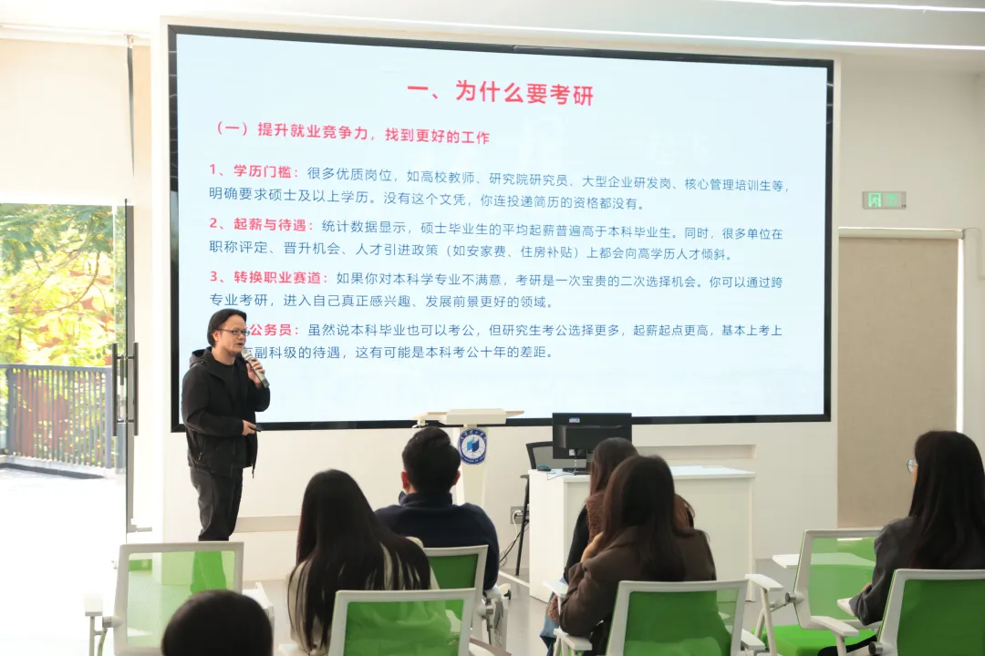 现场氛围热烈,同学们专注聆听、积极互动,会后纷纷表示收获满满。“一对一规划解决了我的盲目备考问题”“学院的资源支持太实用,对考研更有信心了”。此次宣讲会是学院聚焦菁英培养的重要举措,未来学院将持续搭建优质平台,提供精准指导,助力学子在人生赛道上奋勇争先。