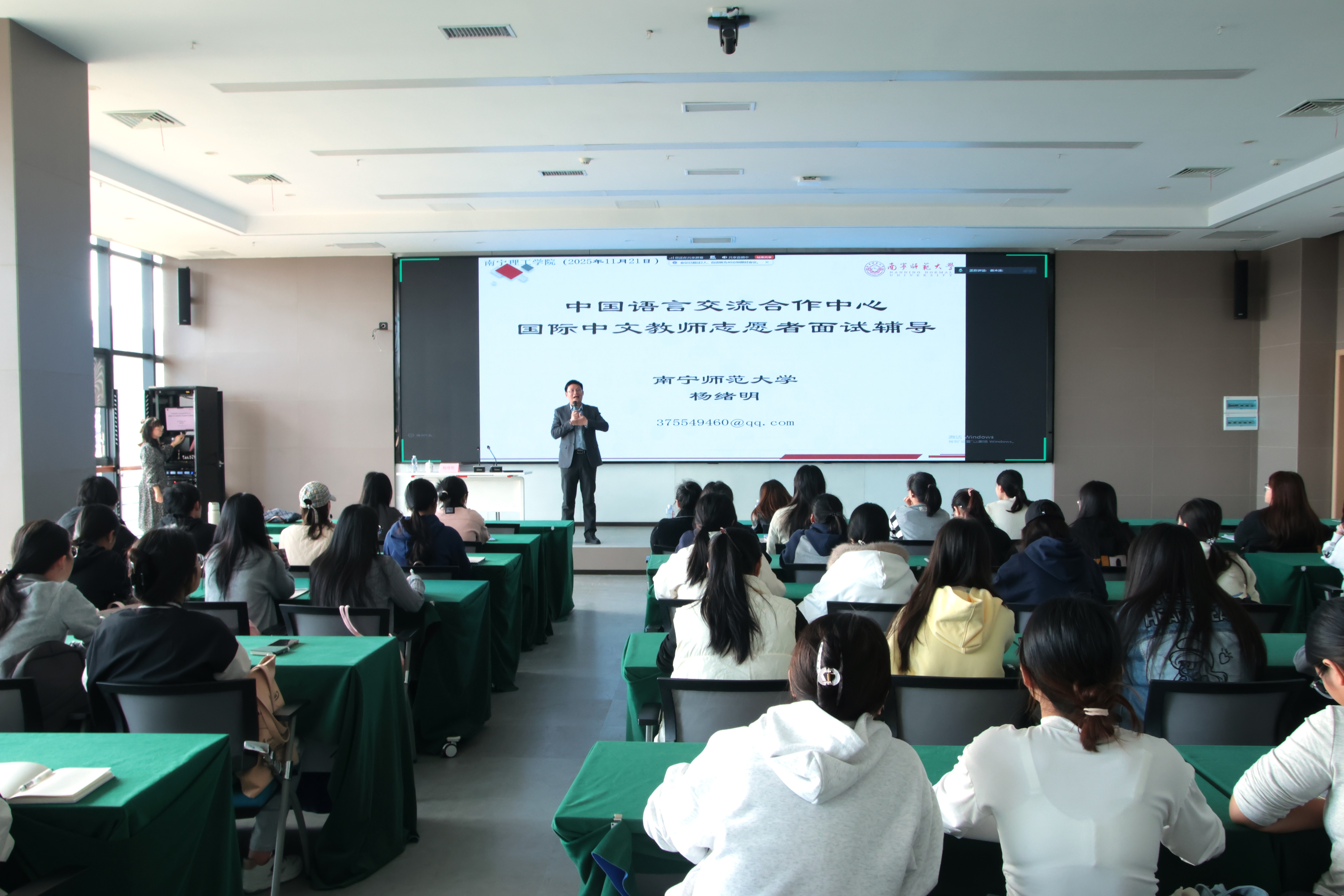 11月21日,由南宁理工学院新视域文化产业学院主办的“国际志愿者考试备考指南:高效通关与能力提升”讲座于图书馆618会议室顺利举行。本次活动特别邀请南宁师范大学国际教育学院杨绪明教授担任主讲,百余位同学到场参与,现场氛围热烈。
