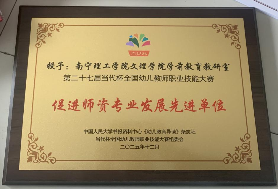 近日,第二十七届“当代杯”全国幼儿教师职业技能大赛评选结果揭晓。本次大赛吸引了全国近400所院校与幼儿园参与,竞争激烈。南宁理工学院新视域文化产业学院主办、文理学院承办的学前教育专业学子在此次大赛中表现突出,共斩获全国一等奖9项、二等奖12项、三等奖17项、优秀奖6项,累计获奖44项,展现了学院在学前教育人才培养方面的扎实功底与创新活力。获奖学生在文理学院专业品牌之夜接受颁奖。